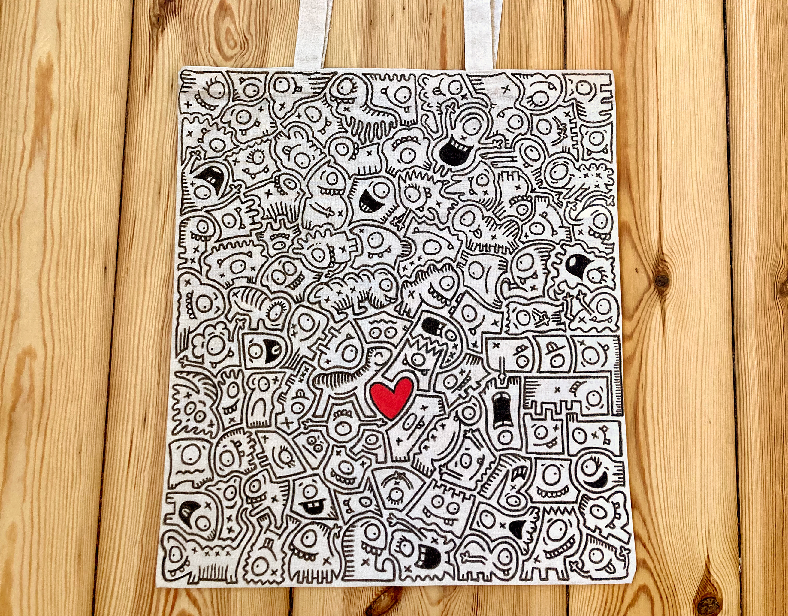 Binies with red heart on an tote bag. Here you can see a bit of the process - SOLD