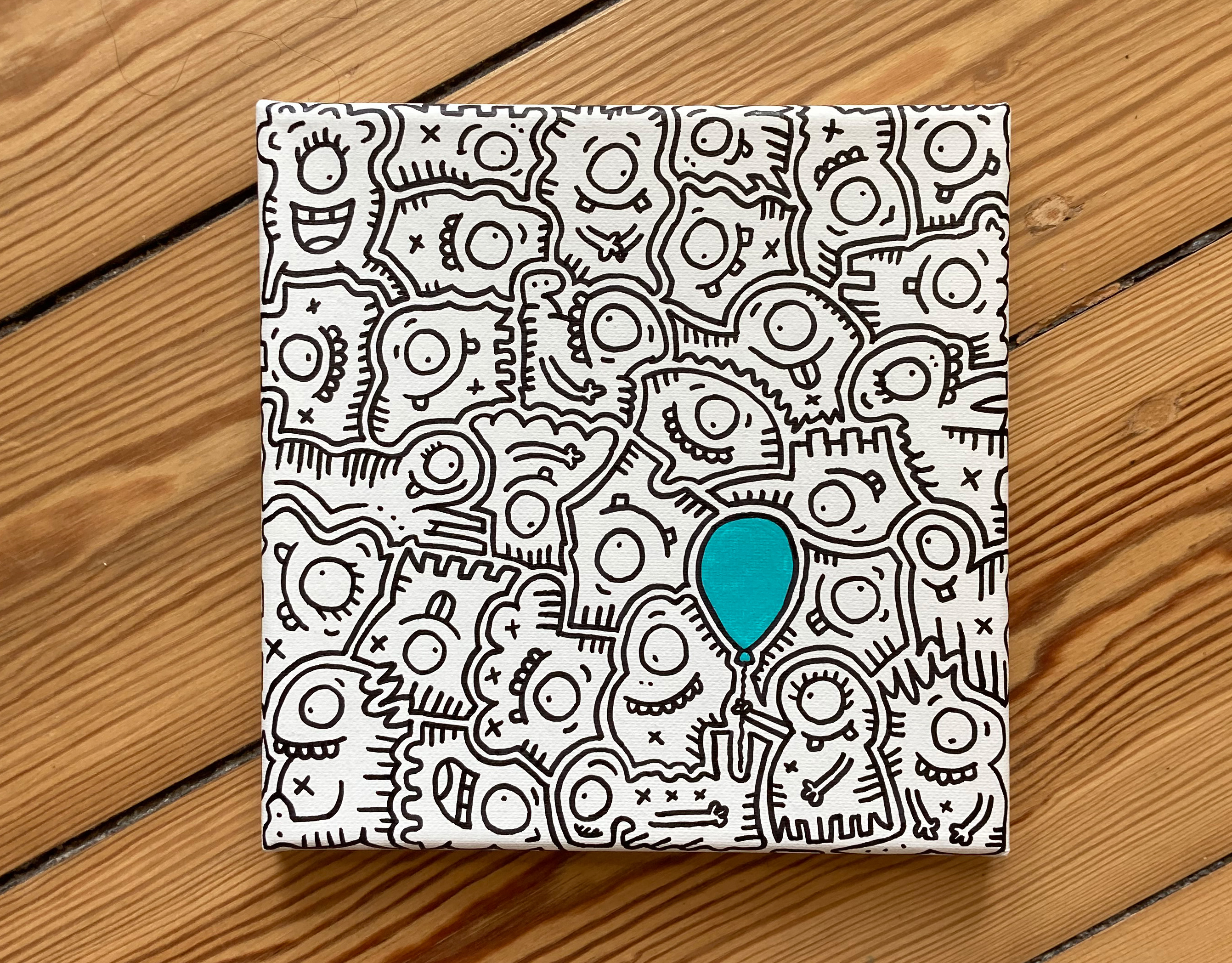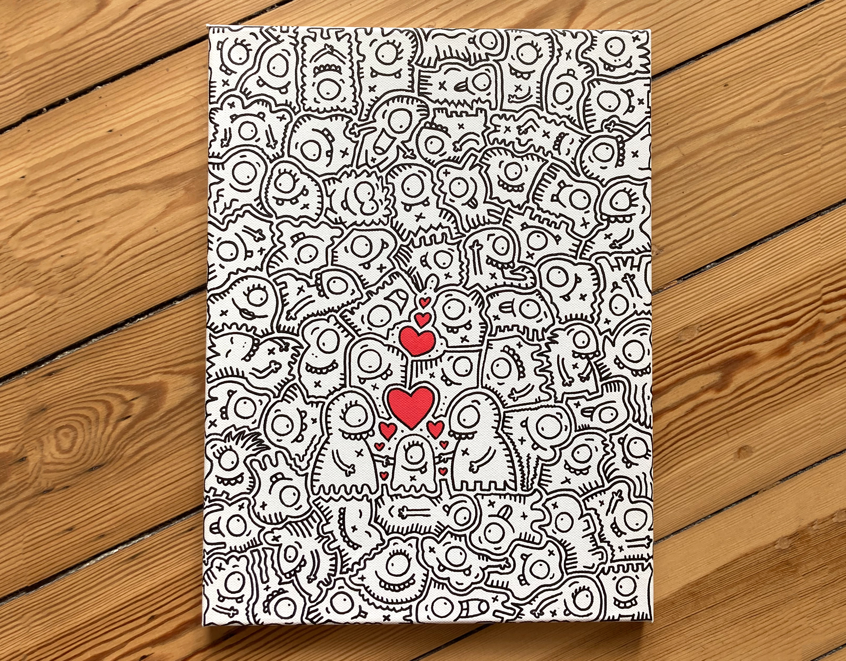 Binies with red hearts on an unframed canvas. Done on request for a family of 3 - SOLD